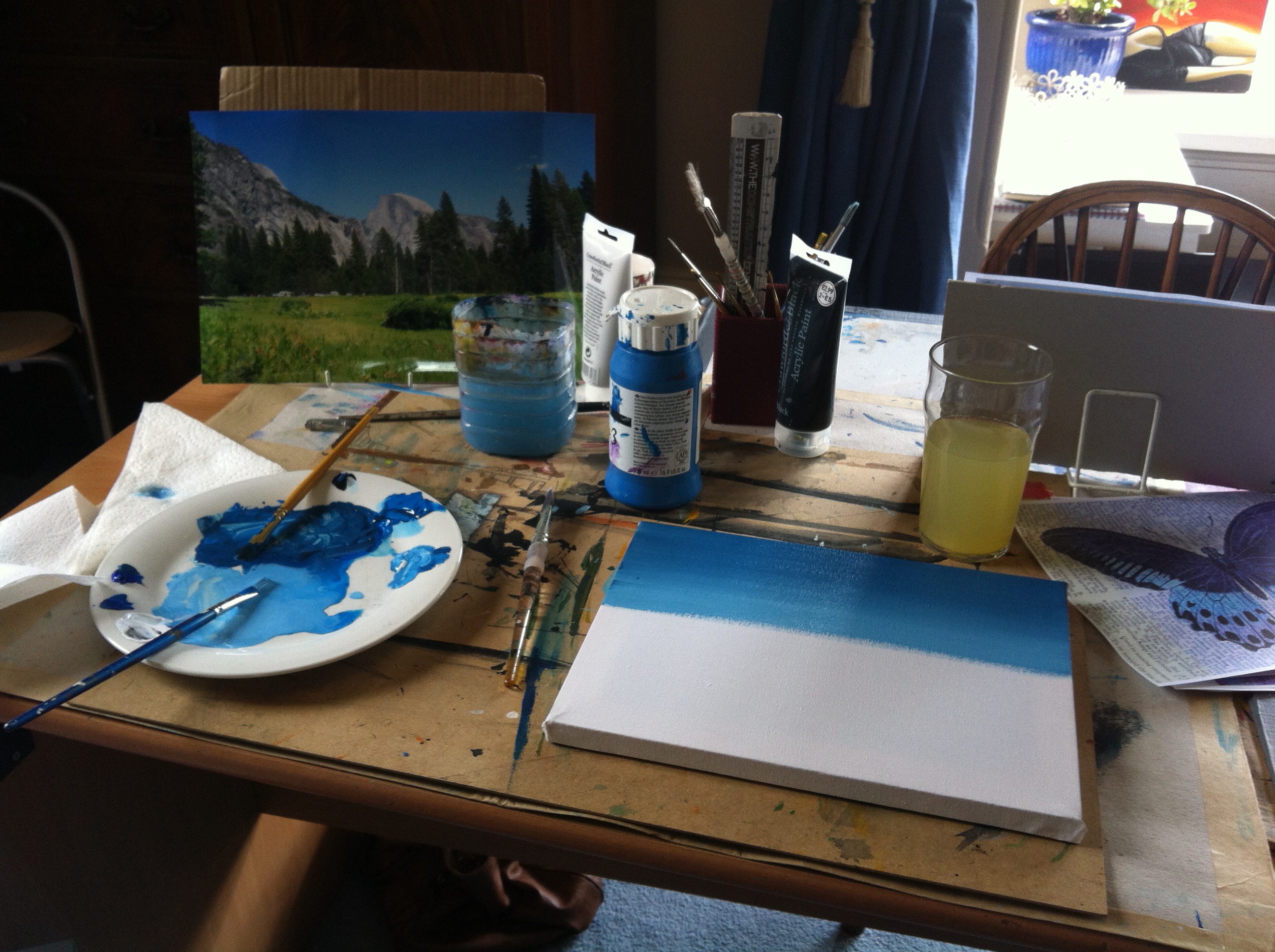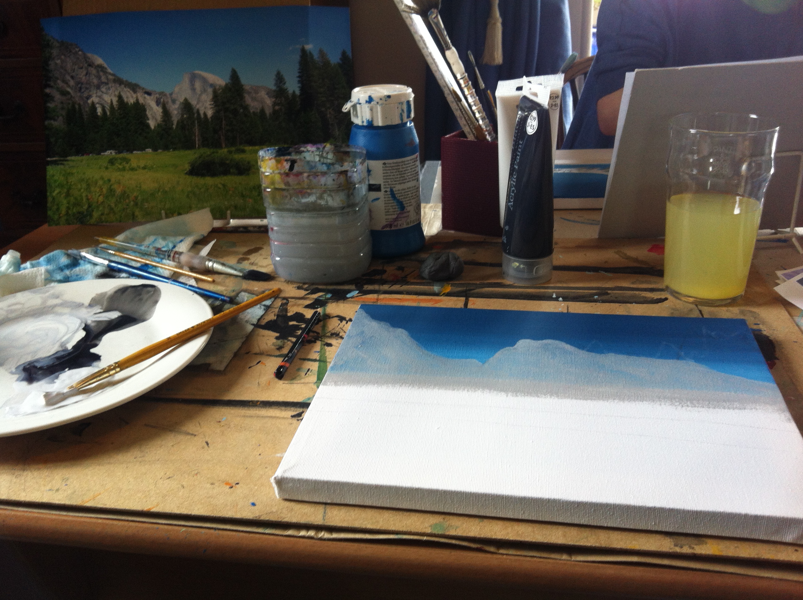 I was relieved to discover that I could paint whatever I wanted to. I was never one to create something brilliant from a bowl of fruit and I’m not sure how I would fair with a nude model, even if it were David Beckham or George Clooney. So armed with my photograph of Half Dome at Yosemite (dating back to my 2007 road trip we took with my brother and his girlfriend) and my roll of paper towel (this is the equivalent of taking an apple in for your favourite teacher at art class, in that you automatically score bonus points for not using more of her supplies!), I embarked on my little adventure.