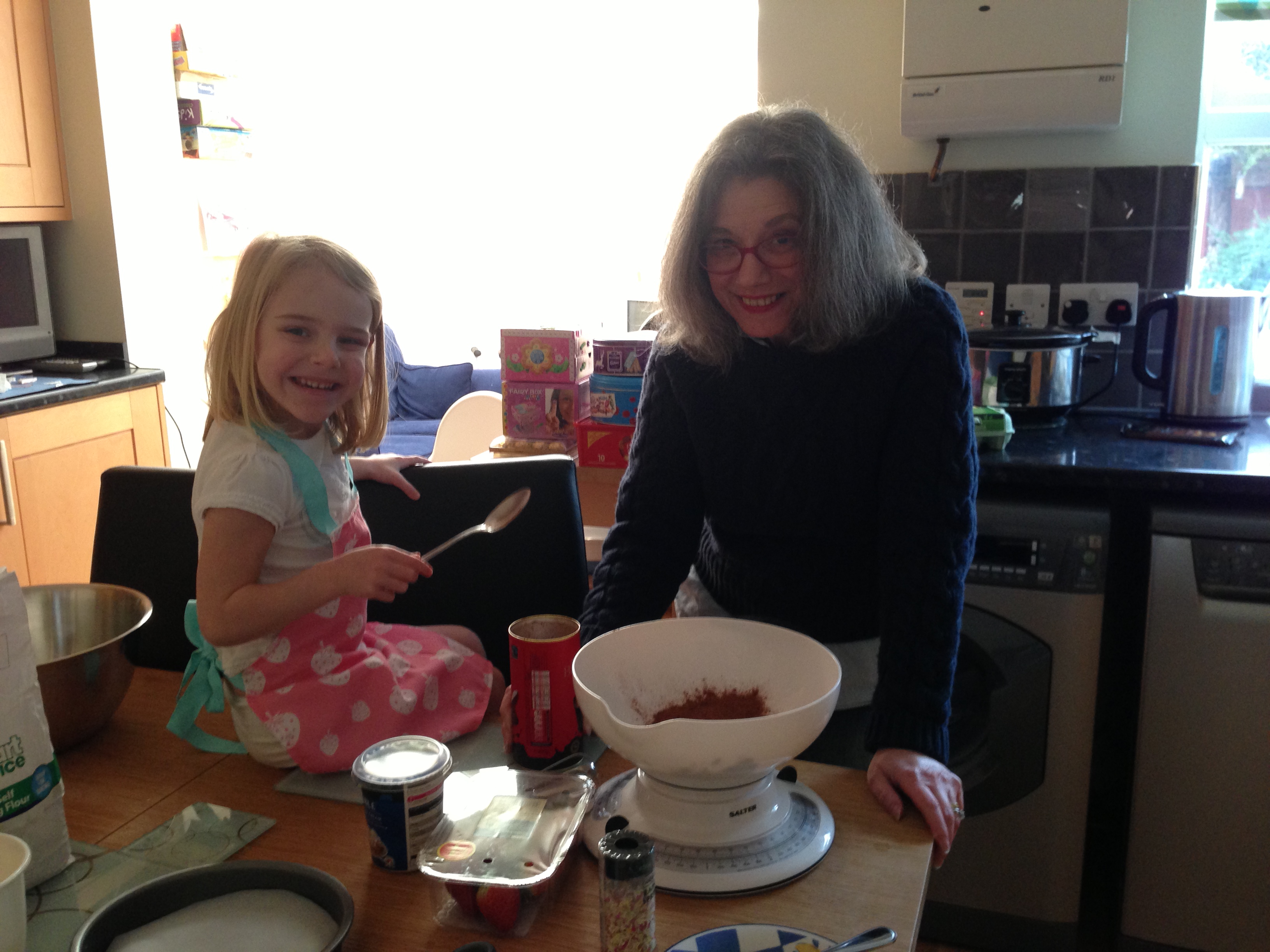 These days I don’t need much excuse to don the apron, roll my sleeves up and get the baking gear out of the cupboard and last week to celebrate my Dad’s (Grandpa’s) birthday, provided the perfect excuse. Over the last few years, the children’s birthdays have given me ample opportunity to practice making Victoria sponge and Madeira cakes and I for one was ready to consume something different. Inspired by a Facebook photograph of a cake that my friend made for her husband’s birthday recently and my father’s love of chocolate, ok my love of chocolate, I decided that a chocolate sponge cake was in order. My mother reminded me that this was not in fact my first chocolate sponge cake offering. As a child, I had spent several hours throwing together a chocolate sponge cake in celebration of one of her birthdays. A recipe at the age of 8 or 9 was obviously considered a hindrance to the creative process. The fact that I refused to touch even a morsel of the finished article, speaks volumes about the success of that experiment. Anyway, this was Ava’s first chocolate sponge cake and definitely the first time that three generations of the Collins girls have baked together (for those of you who know my mother, you’ll know how rare this is!).